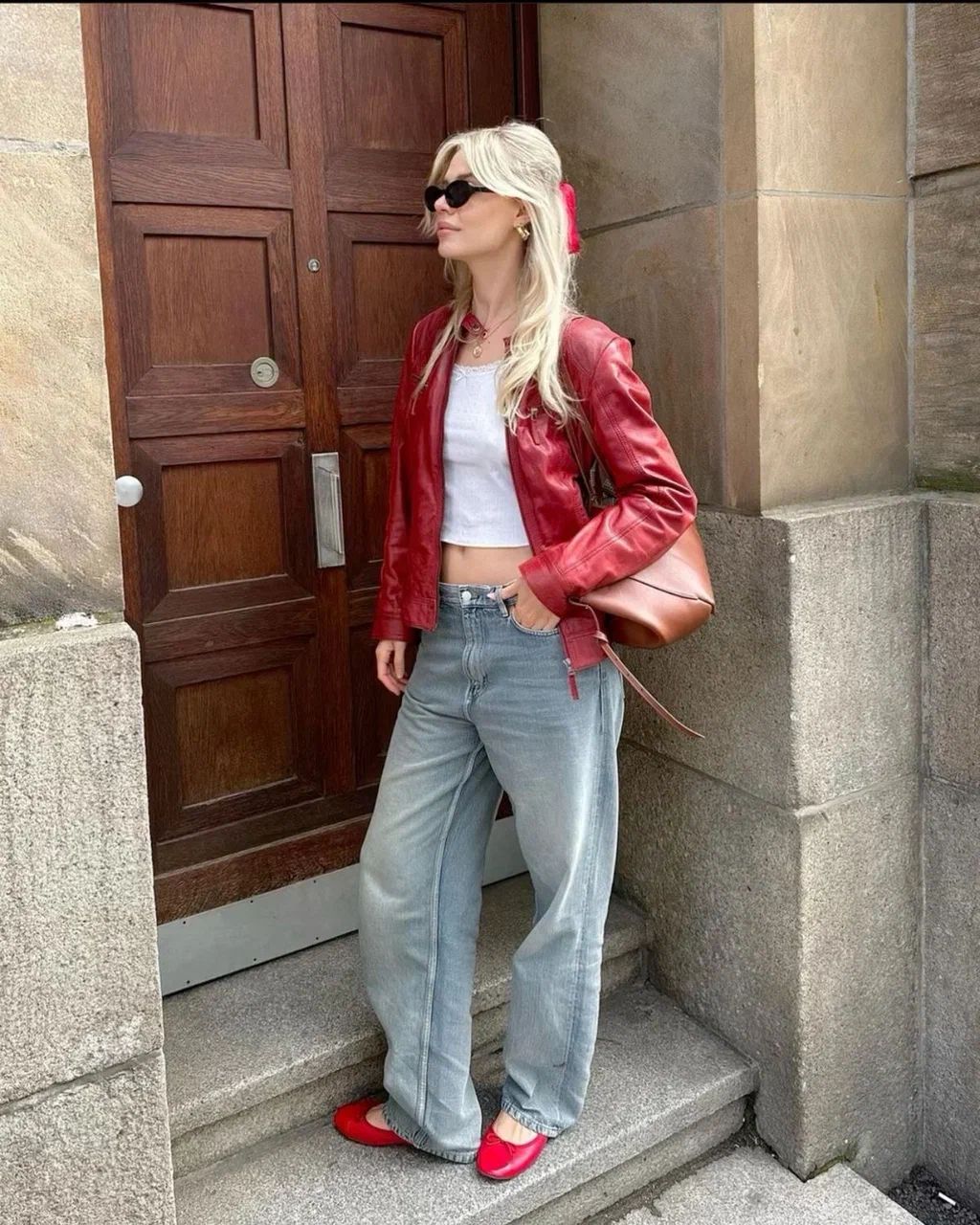 Красная обувь — тренд 2024 года. Такие балетки будут служить классным акцентом в повседневных образах — их можно сочетать с гольфами или носками, а можно надевать их с вещами нейтральных оттенков и разбавлять красной помадой на губах. Они помогут сделать образ более интересным и сложным.