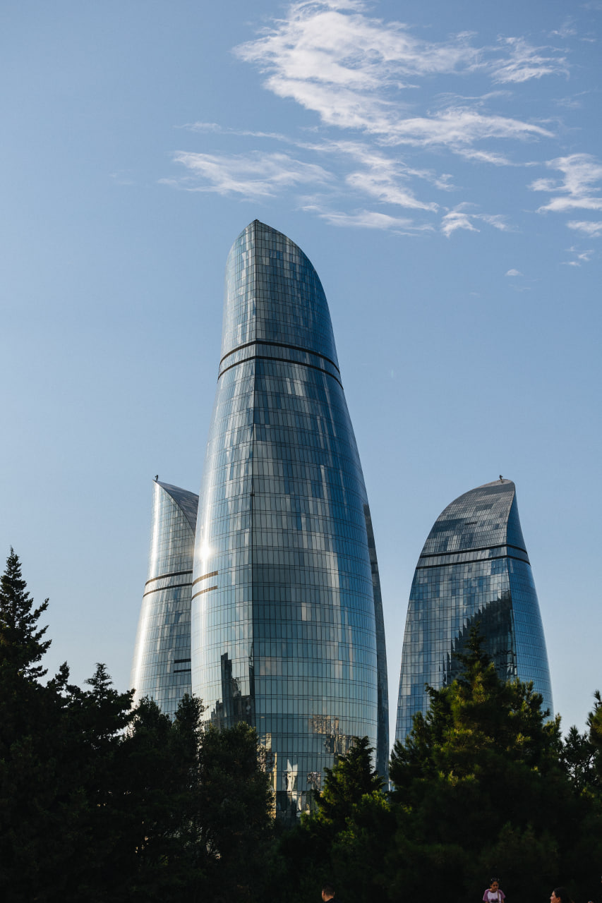 Современный Баку — город необычной архитектуры. Доминантой столицы можно назвать комплекс Flame Towers. Три здания в форме языков пламени полностью покрыты LED-экранами, проекция ночью напоминает движение огня.